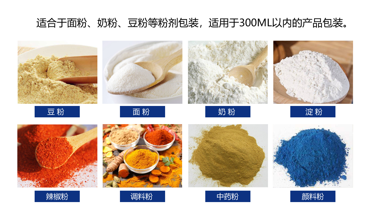 适用面粉、奶粉、豆粉等粉剂包装,适用于300ml以内的产品包装。
